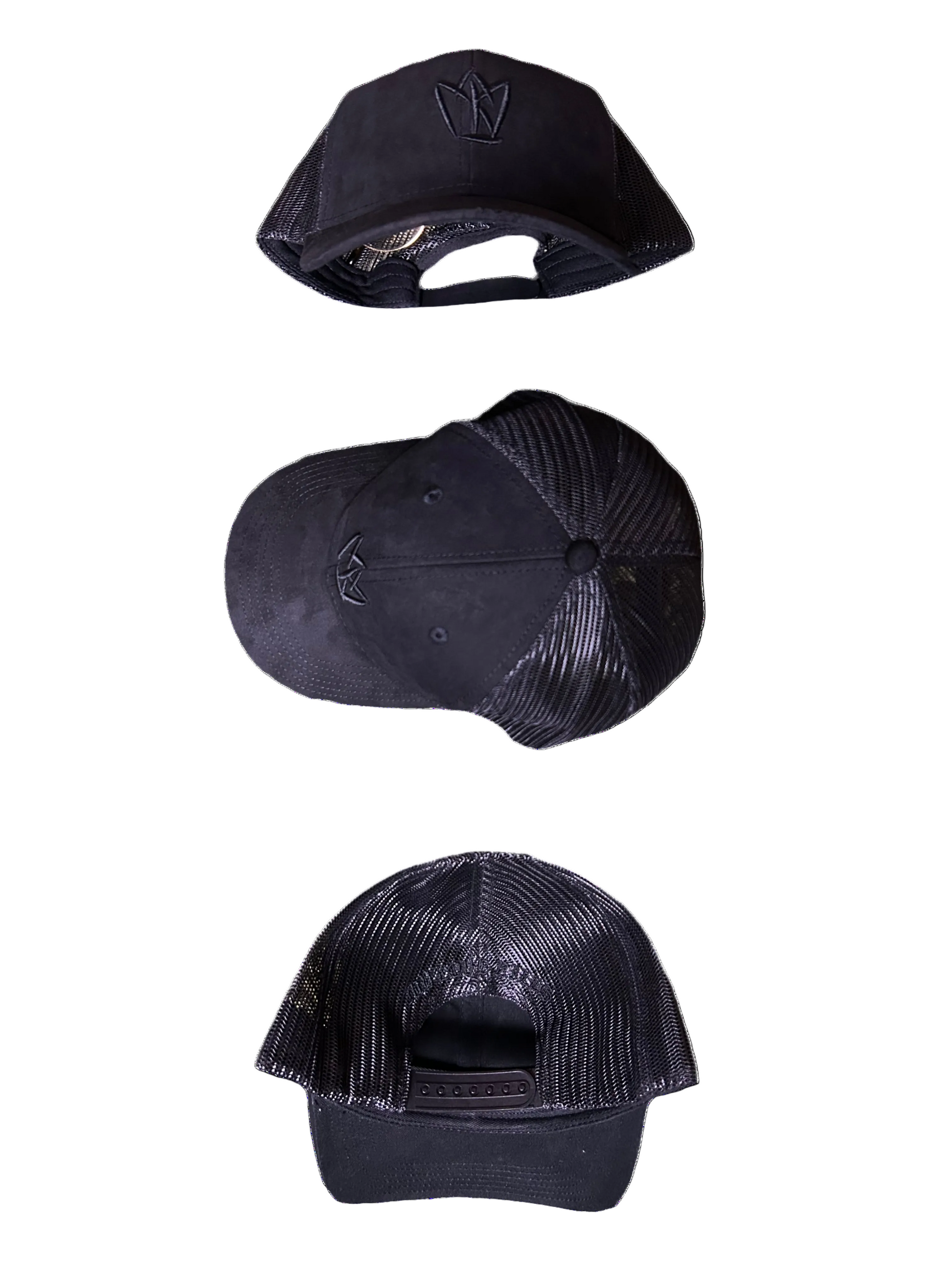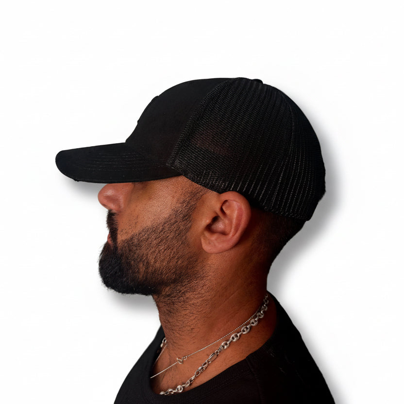 This is a sleek, all-black baseball cap featuring a minimalist embroidered logo on the front panel. The design is subtle and stylish, with the logo stitched in the same black tone as the fabric, giving it a modern and understated look. The cap has a structured crown with a curved brim, and the back is made of breathable mesh material, adding a sporty edge while ensuring comfort and ventilation with a slick black stitching writing saying “MY LOVE KILLS”