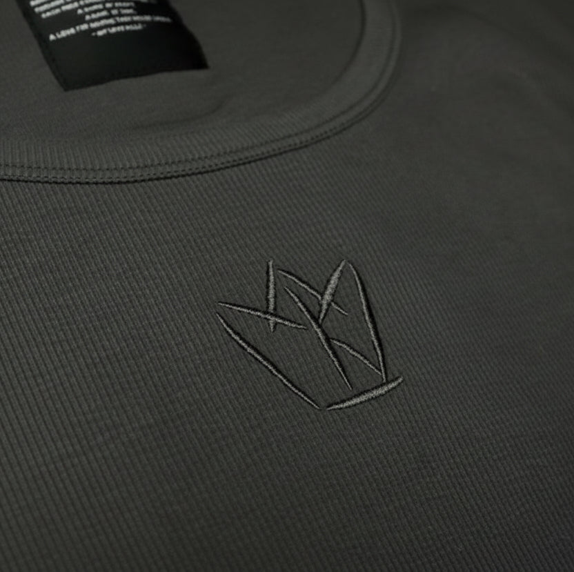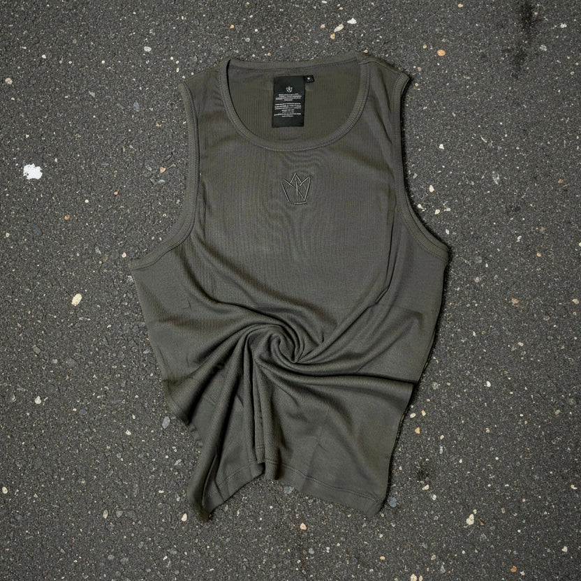 This sleek grey sleeveless vest is crafted from a soft, breathable fabric, perfect for both casual wear and layering. It features a round neckline and a slim, tailored fit that accentuates the shoulders and torso. At the center of the chest, there’s a subtle embroidered crown motif, adding a minimal yet distinctive detail to the otherwise clean design. The vest’s simplicity makes it versatile, pairing effortlessly with jeans, trousers, or even styled under a jacket for a modern, polished look.